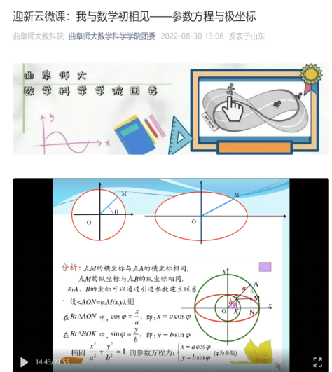 曲阜师大新闻中心讯(通讯员:韦宁)为创新人才培养途径,拓展“全程育人”空间,曲阜师大数学科学学院就大学与高中知识的链接问题进行了全面系统的分析,在2022级新生入学前,先后推出“参数方程与极坐标”“反三角函数”“积化和差、和差化积”“数学危机”“复数及其运算”“集合与映射”等系列迎新云微课,探索大学和中学课程的无缝衔接模式。云微课的推出,受到了广大数学相关专业新生和社会各界的极大关注,点击量达到了上万次。
