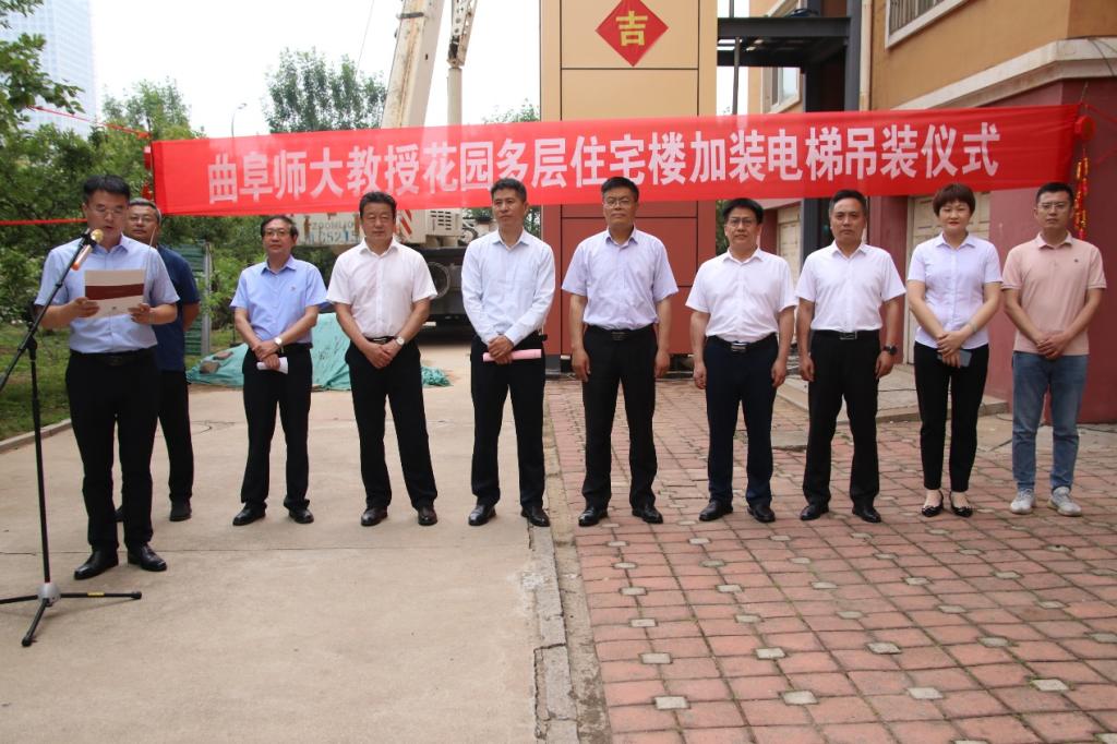 曲阜师大新闻中心讯(通讯员:尹哲睿)6月15日上午,曲阜师大教授花园举行首部多层住宅加装电梯吊装仪式。学校党委副书记卢国强,党委常委、副校长胡凡刚出席仪式,日照校区党委、日照校区办公室、日照校区纪委、后勤管理处、保卫处、明德物业日照城市公司等有关单位负责人,施工单位代表、各分工会代表、业主代表出席仪式。仪式由日照校区办公室主任魏伟主持。