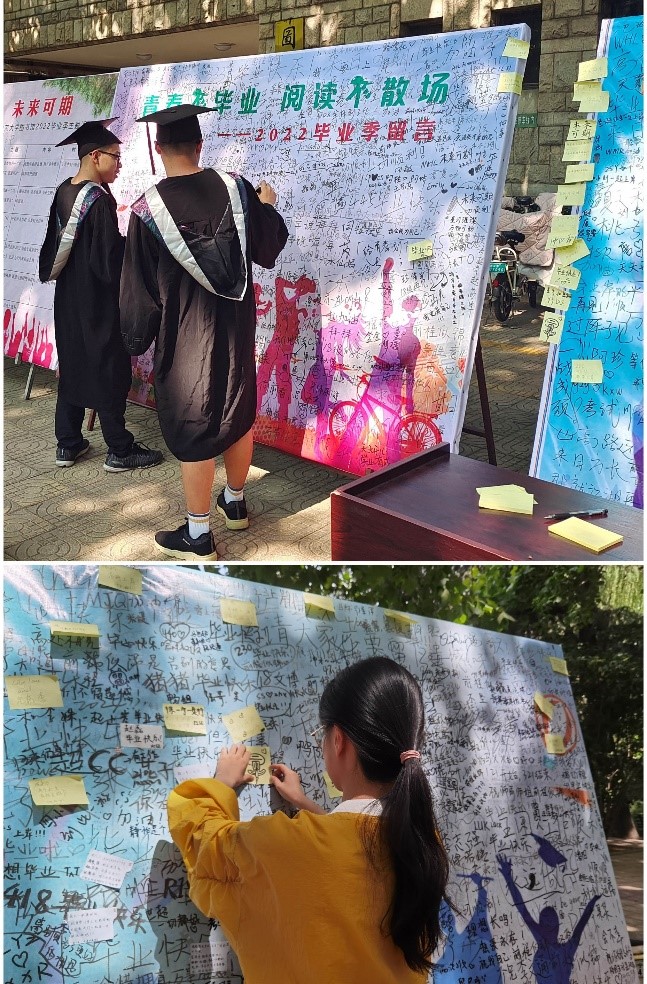 毕业季系列活动分别为言语寄情思——“衣襟带花 迢递可达”活动,在馆前设立毕业生留言墙,供毕业生合影留言寄托情感;曲水悦流觞——“以书为友,传递星火”活动,在优美的语言文字中传递翰墨书香;信笺系真情——“时光无声 光阴留存”活动,分发时光信件,记录曲园光阴;岁月刻印痕——“怀念往昔 记忆卡片”活动,定制2022毕业季专属纪念卡,记录大学四年阅读之路;惜别两依依——“临行之时 诉说过往”活动,绘声绘色的文字与视频,诉说与曲园图书馆的故事。