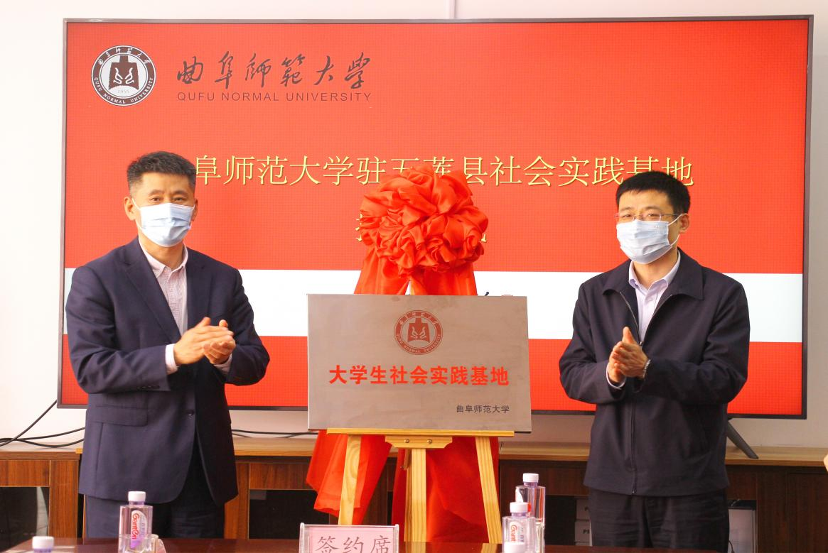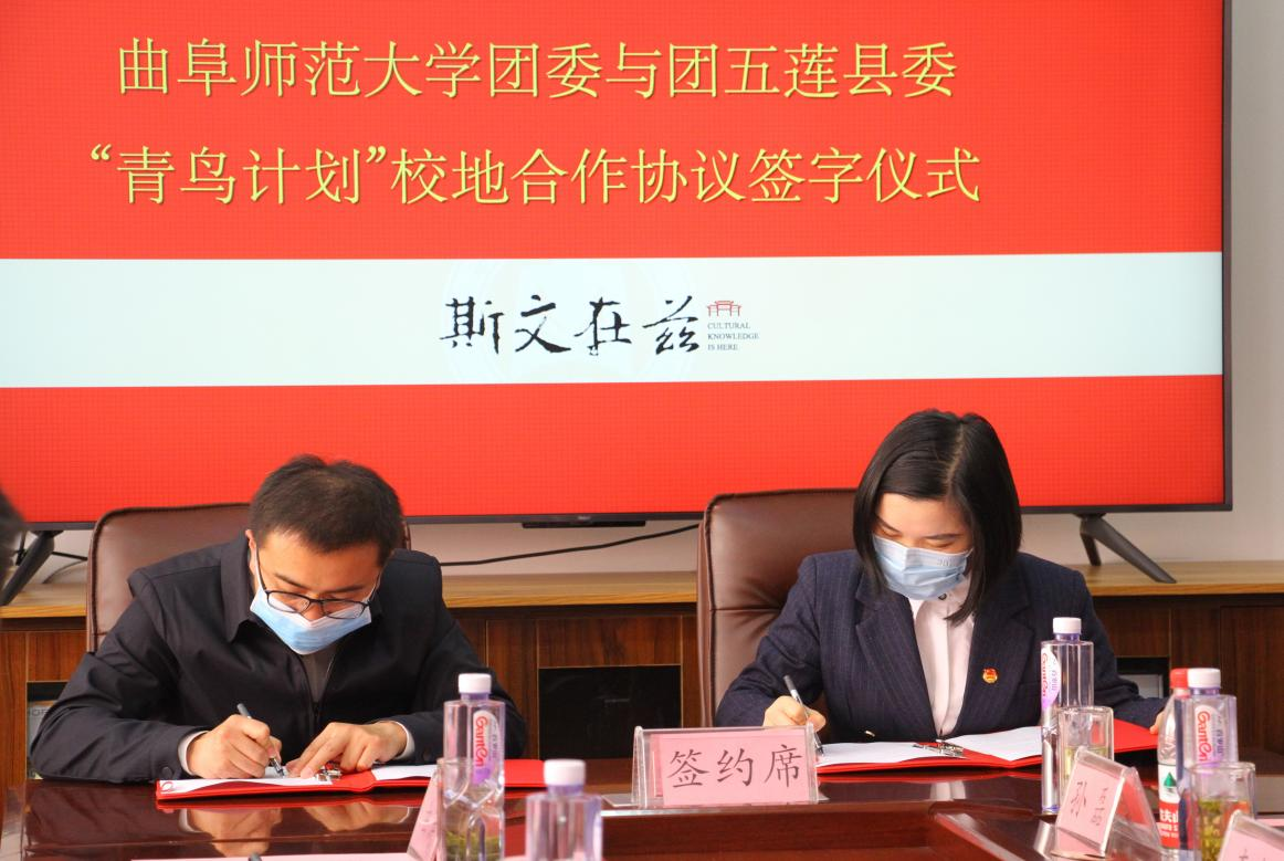 仪式上,校团委书记孔轶众与团五莲县委书记刘畅签署“青鸟计划”校地合作协议书,日照校区党委书记孔令军、五莲县委副书记王军为大发平台驻五莲大学生社会实践基地揭牌。