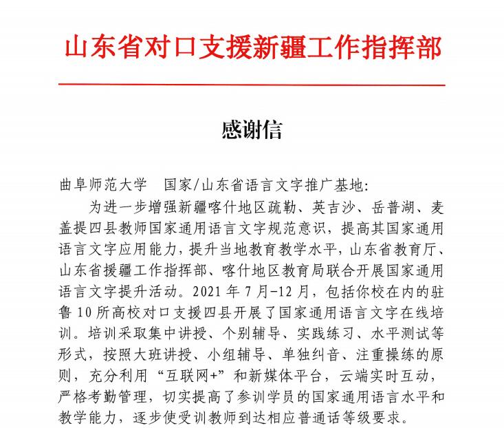 曲阜师大新闻中心讯 1月1日,新疆维吾尔自治区喀什地区教育局、山东省对口支援新疆工作指挥部特向大发平台国家语言文字推广基地发来感谢信,向参与国家通用语言文字在线培训工作的师生表示诚挚感谢。