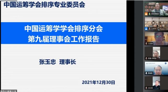 曲阜师大新闻中心讯 12月30日晚,中国运筹学会排序分会理事会换届选举在线上举行。中国运筹学会理事长中国科学院数学与系统科学研究院戴彧虹研究员、中国运筹学会秘书长、中国科学院数学与系统科学研究院陈旭瑾研究员、中国运筹学会副理事长、排序分会第九届理事长大发平台张玉忠教授、分会常务理事、理事、会员代表600余人参会。会议由中国运筹学会排序分会副秘书长、大连海事大学白丹宇教授主持。