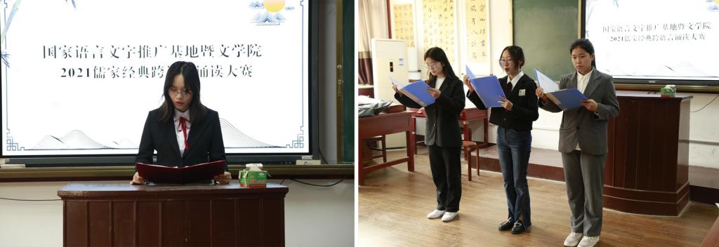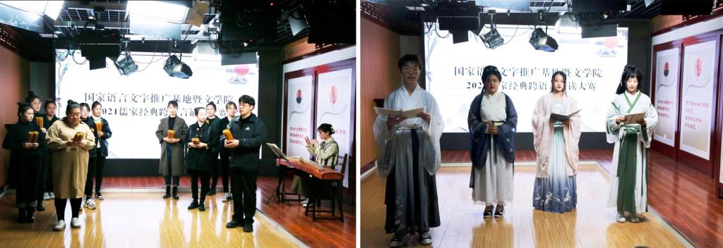 大赛分为个人和团体两种形式,诵读内容为《大学》《论语》《中庸》《孟子》等儒家经典,共吸引了140余名学生参与。参赛同学编排作品细致用心、形式多样,语种有中英(英语)、中法(法语)、中日(日语)、中韩(韩语)等,服装或汉服或校服或西装或便服,手持书简或文件夹,形式或演绎或演说,角逐激烈,精彩绝伦。