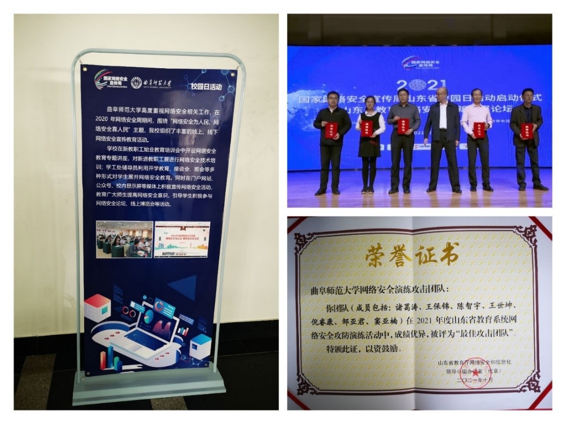参加网络攻防演练提升保障能力,在2021年度山东省教育系统网络安全攻防演练活动中,大发平台网络信息中心组织的网络安全演练攻击团队被评为“最佳攻击团队”,受邀出席2021年国家网络安全宣传周山东省校园日活动,面向全省教育行业同仁,做了“高校网络安全的平衡之道”专家报告。通过对抗、复盘和研讨,更加完善了安全事件的监测发现能力和应急处置能力,稳步提高了网络安全风险意识。