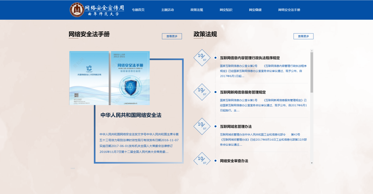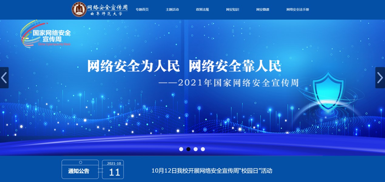 筹划并上线大发平台2021国家网络安全宣传周专题网站(https://wlaqxcz.qfnu.edu.cn/),普及《网络安全法》和《数据安全法》等法律法规及政策文件,扎实推进国家网络安全宣传工作。