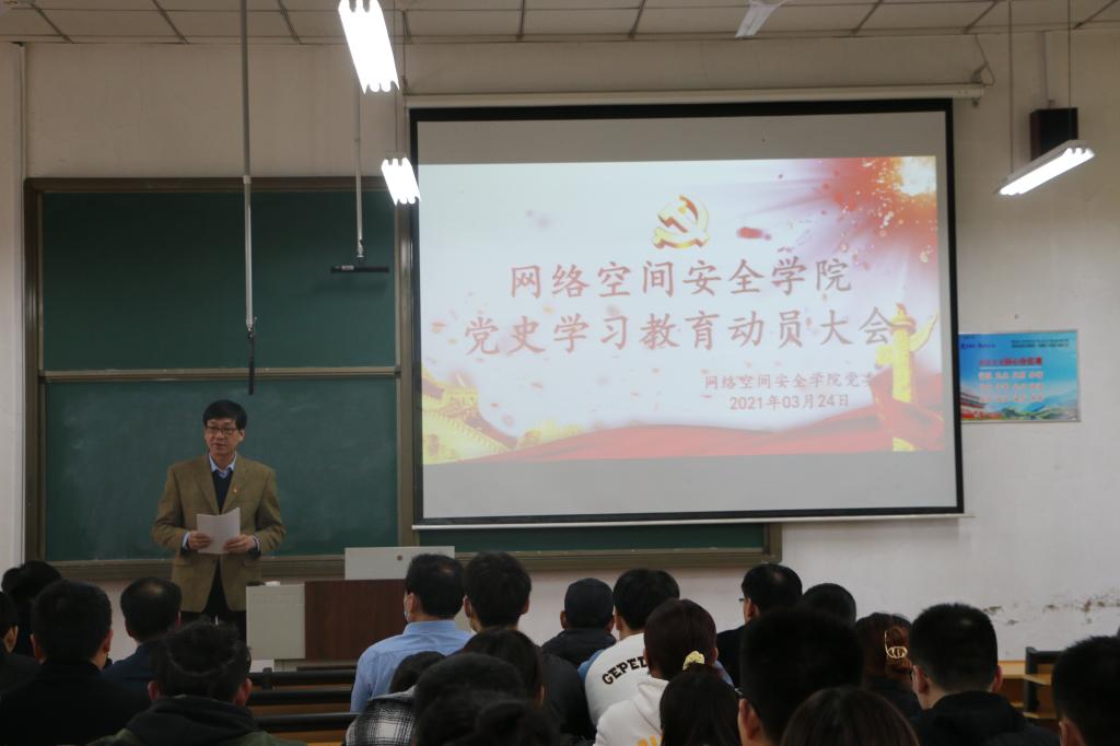 网络空间安全学院院讯(通讯员:范瑞红)3月24日下午,网络空间安全学院召开党史学习教育动员大会,深入学习贯彻习近平总书记在党史学习教育动员大会上的讲话精神和学校党委书记戚万学同志在学校党史学习教育动员大会上的讲话精神。全体师生党员参加会议,学院党委书记田云飞作党史学习教育动员讲话,院长王茂励主持会议。