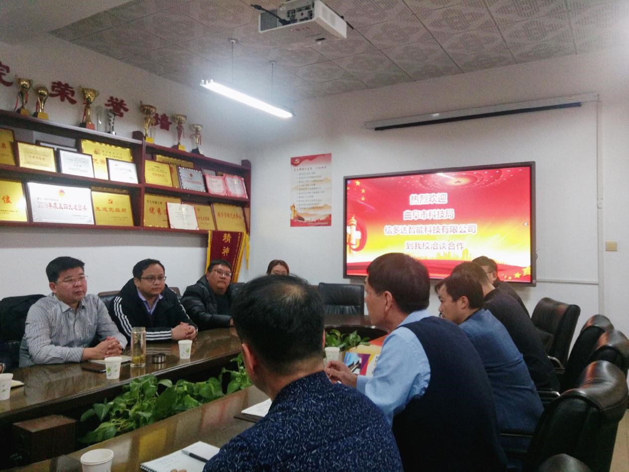 曲阜师大新闻中心讯(通讯员:高鹏)12月23日下午,大发平台与曲阜市科技局、曲阜信多达智能科技有限公司在网络空间安全学院会议室举行校企合作洽谈会。曲阜市科技局局长谷传超、副局长李凯、高新技术科科长高文龙;曲阜信多达智能科技有限公司总经理陈国营、总工程师孙亮;科技处开发科科长朱年磊、网络空间安全学院党委书记田云飞、副院长倪建成出席洽谈会。