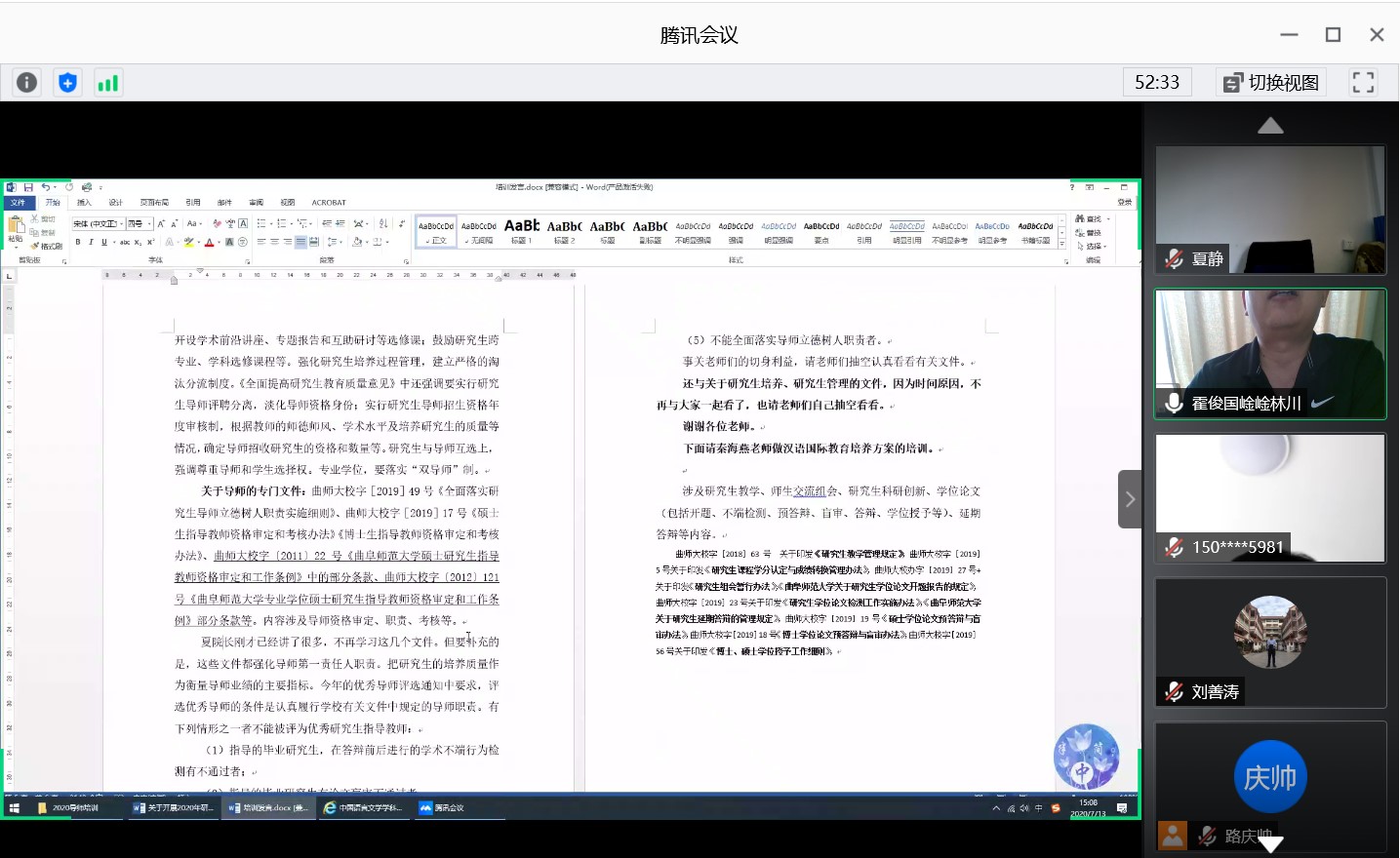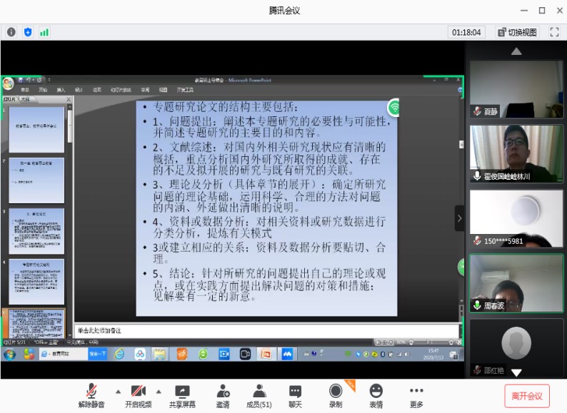 曲阜师大新闻中心讯 为进一步提高研究生导师指导能力、保证研究生培养质量,根据学校决定和要求,713日下午,文学院举办了2020年研究生导师线上培训会,全体研究生导师参加了此次会议。会议由院长助理霍俊国副教授主持。