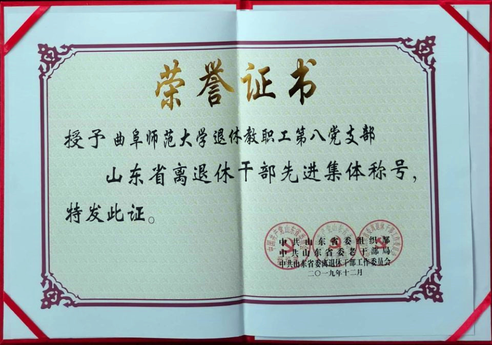 曲阜师大新闻中心讯(通讯员:丰湘)日前,山东省老干部工作和离退休干部“双先”表彰大会顺利召开,大会由中共山东省委组织部、中共山东省委老干部局、中共山东省委离退休干部工作委员会联合举办,曲阜师大离退休教职工党委第八党支部被授予山东省离退休干部先进集体荣誉称号。