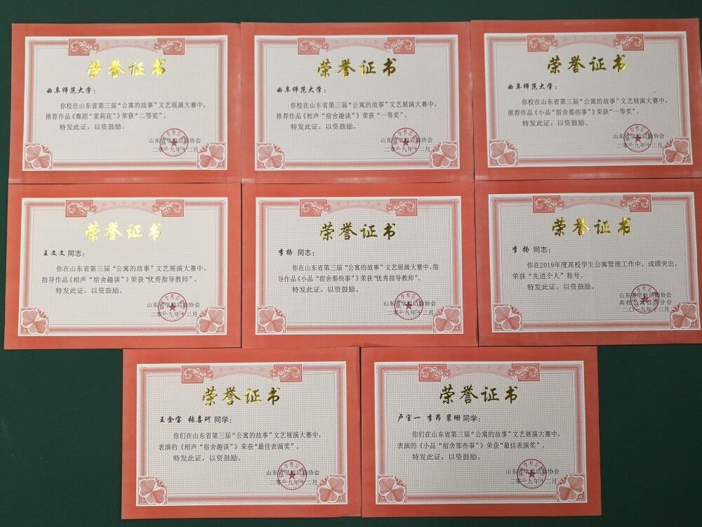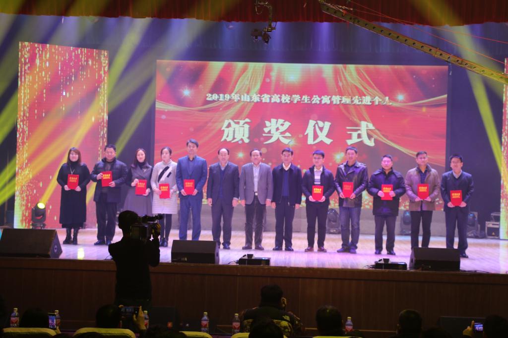 会议宣读了2019山东省第三届“公寓的故事”主题宿舍文化活动获奖名单并进行了表彰,我校报送的优秀作品相声《宿舍趣谈》和小品《宿舍那些事》双双获得一等奖,舞蹈《茉莉花》获得二等奖,我校荣获“优秀组织奖”,学生工作处王文文、李扬分别获得优秀指导教师和先进个人荣誉称号。
