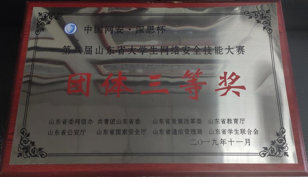 近日,在第八届山东省大学生网络安全技能大赛中,我校信息科学与工程学院学生黄富能、张超、于泽航组成的代表队获得团体三等奖。