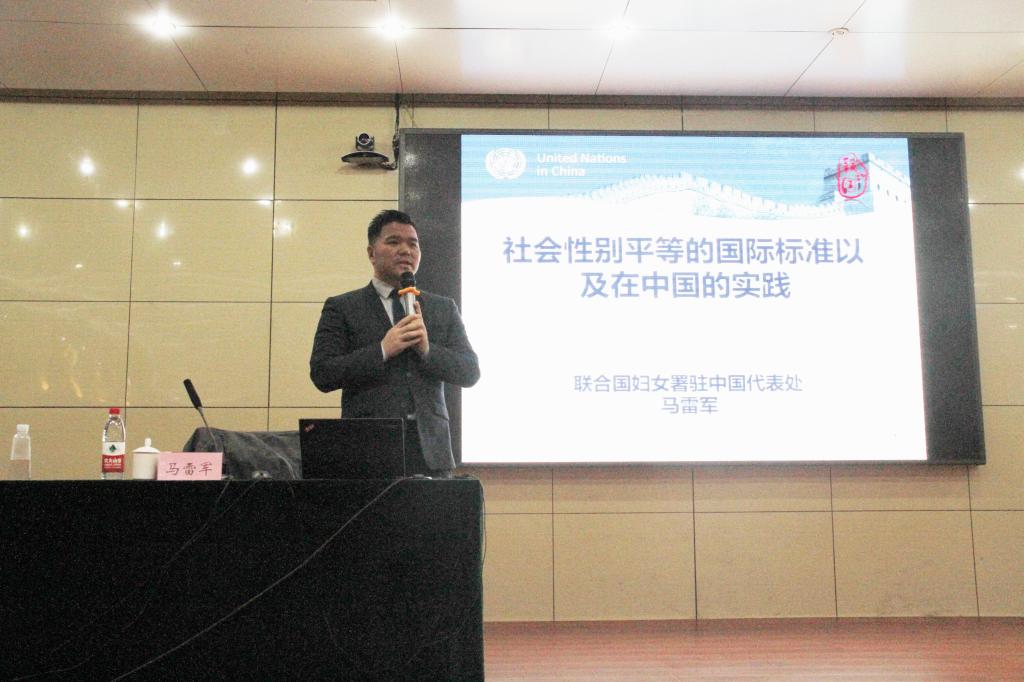 3月1日下午,为进一步加强“男女平等基本国策”宣传教育,在第109个国际妇女节来临之际,我校工会(妇委会)与日照市妇联联合举办的“男女平等基本国策进高校”专题报告会成功举办。联合国妇女署驻华办公室高级项目官员、管理学博士、著名性别专家马雷军教授受邀做专题报告。校区各分工会工会委员、女工委员、女教工代表以及学生代表聆听了报告。