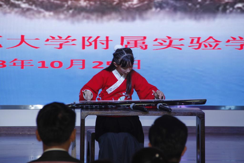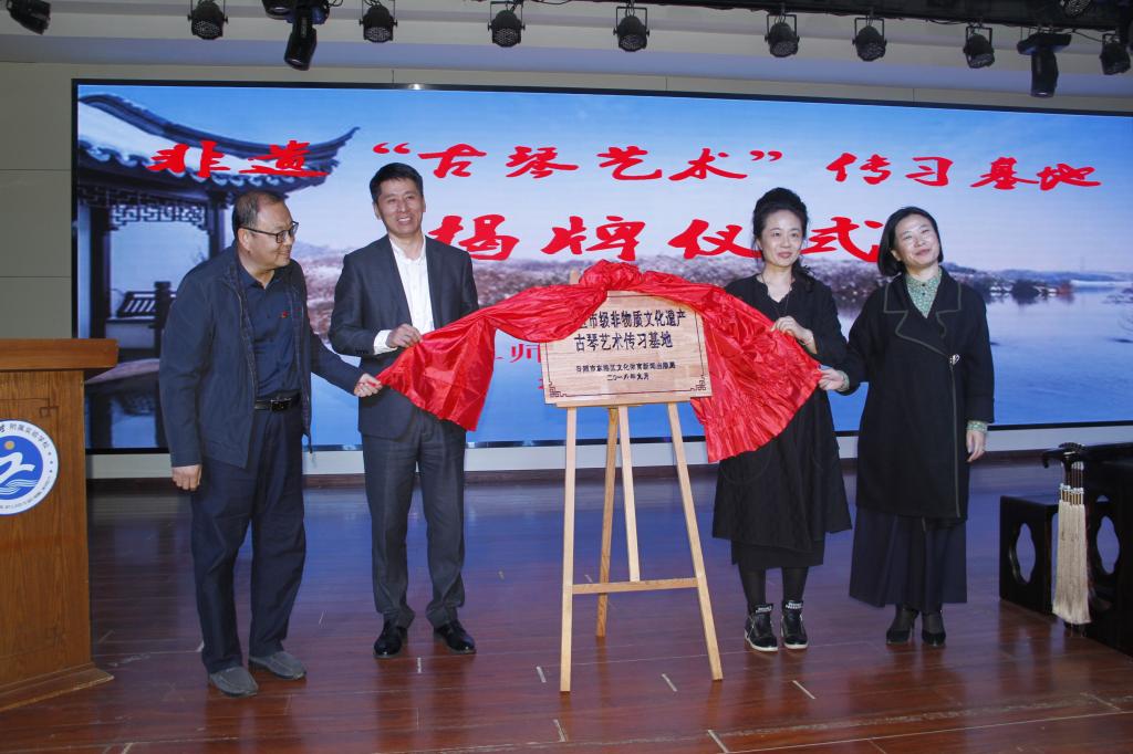 10月25日上午,大发平台附属实验学校非遗“古琴艺术”传习基地揭牌仪式在学校报告厅举行。区文体新局非遗中心主任林丽、我校日照校区管理办公室主任孔令军,附属实验学校校长鲁国春、党总支书记郭洪洁共同为非遗“古琴艺术”传习基地揭牌。