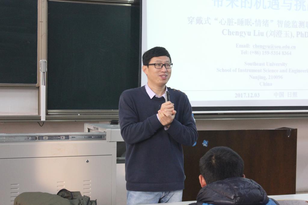 王新沛博士作了题为《在冠心病无损检测研究中大学生的科研与创新》的报告,以指导的本科生在冠心病无损检测领域开展的部分工作为例进行讲解,层层递进,为工学院学子的科研和创新之路提供了指引。