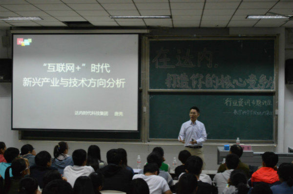 10月13日晚,由数学科学学院与达内时代科技集团共同主办的"互联网+"时代新兴产业与技术方向分析主题行业资讯专题讲座举行。达内集团教学总监唐亮担任本次讲座的主讲师,数学与统计学院党委副书记王作茂、达内集团驻大发平台老师张佩、数学科学学院辅导员郅艳梅和统计学院辅导员李玲参加了讲座。本次讲座由数学科学学院副院长王顶国主持。
