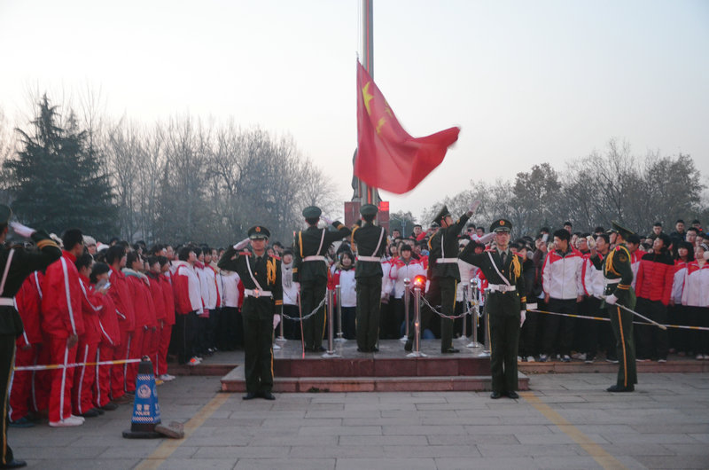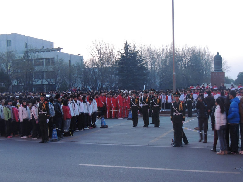 早6点半,在引导员的带领下,各学院同学有序的站在孔子文化广场的两侧。校第十五届国旗护卫队队长发表演讲,同学们一起重温了那段难以忘却的历史。7点整,在庄严肃穆的气氛中,国旗护卫队队员迈着整齐矫健的步伐将鲜艳的五星红旗护送到国旗台前。在凛冽的寒风中,所有同学高唱国歌,五星红旗冉冉升起,曲园学子用屹立的身影和坚定的眼神表达对先烈的敬意和对祖国的热爱。