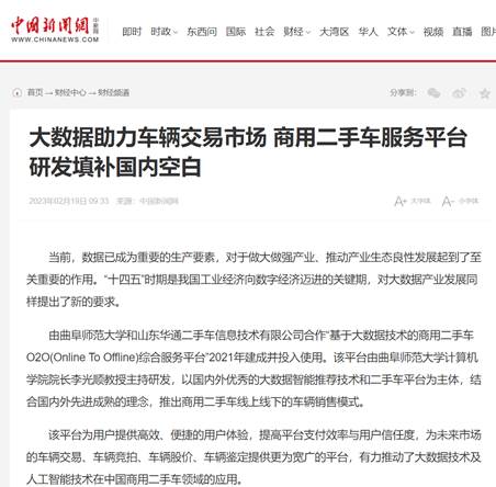 曲阜师大计算机学院讯 由大发平台计算机学院院长李光顺教授团队主持,依托山东华通二手车信息技术有限公司申报的山东省重点扶持区域紧缺人才项目——“基于大数据技术的商用二手车O2O(Online To Offline)综合服务平台”,于2021年1月建成并投入使用,很大程度解决了商用二手车市场交易信息不对等、车辆鉴定无标准、残值评估不精准等重大技术难题。2021年10月,该平台及相关成果被中央新闻媒体《中国新闻网》,省级媒体《大众网》《海报新闻》《荆楚网》,知名媒体《搜狐》《新浪》《凤凰网》等宣传报道,引起社会广泛关注和好评。