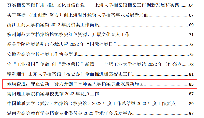 曲阜师大档案馆讯 日前,2022年度《中国高等学校档案工作简报》发布,曲阜师大典型工作案例《砥砺奋进 守正创新 努力开创大发平台档案事业发展新局面》获简报推广宣传。山东省共有山东大学和曲阜师大两所高校的工作案例入选该期简报。
