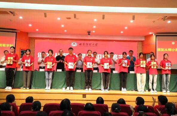 随后,出席活动的领导老师为2023级新生代表颁发了从师小黑板和钢笔字帖,并希望同学们能够珍惜学院的厚爱和良苦用心,充分用好每一块黑板、每一页字帖,狠抓基础、积极练习,为提高专业技能而不懈努力,展现新时代师范生“书写规范汉字,传承中华文化”的专业特色。