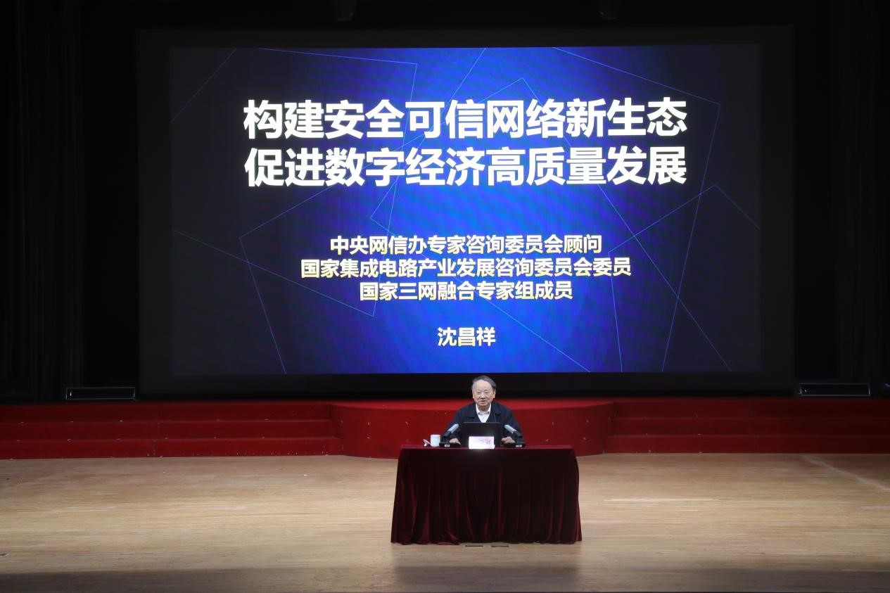 随后,沈昌祥院士作了题为《构建安全可信网络新生态,促进数字经济高质量发展》的报告。他从数字经济时代的机遇与挑战、构建安全可信数字经济保障体系、打造主动免疫可信计算数字产业新生态、加快网络空间安全学科建设和人才培养等四个方面进行阐释,详细介绍了国产化替代的“五、三、一”原则。