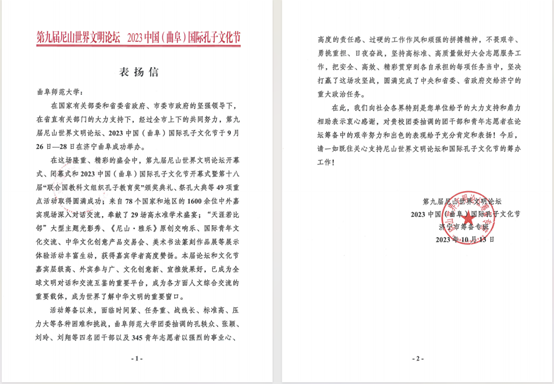 曲阜师大团委讯  日前,曲阜师大收到来自第九届尼山世界文明论坛、2023中国(曲阜)国际孔子文化节济宁市筹备专班的表扬信,对学校认真组织大学生志愿者为第九届尼山世界文明论坛成功举办提供有力保障表示诚挚感谢。
