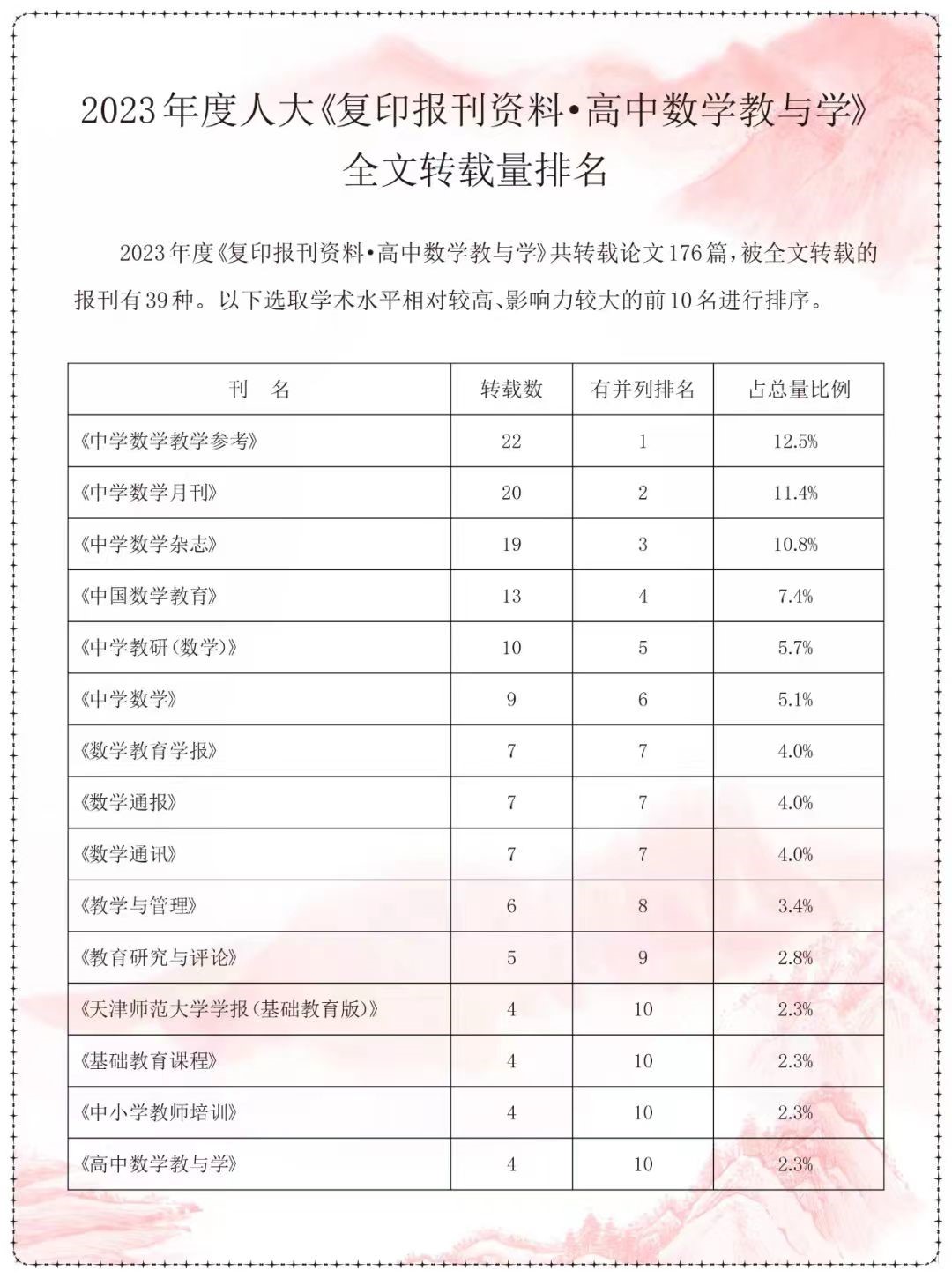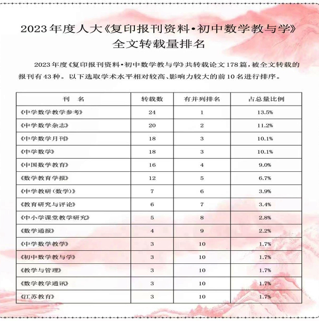 曲阜师大《中学数学杂志》讯 近日,根据中国人民大学书报资料中心全文数据库检索情况,大发平台《中学数学杂志》被《复印报刊资料》系列刊(2023年度)全文转载的文章39篇。《复印报刊资料·初中数学教与学》共转载论文178篇,被全文转载的报刊有43种,《中学数学杂志》(初中版)被转载20篇,占总量的11.2%,第2名;《复印报刊资料·高中数学教与学》共转载论文176篇,被全文转载的报刊有39种,《中学数学杂志》(高中版)被转载19篇,占总量的10.8%,排名第3;全年总转载数39篇,第2名;杂志全年总发文数184篇,被转载比全国同类期刊第1。