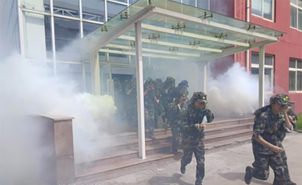 会后,消防官兵为同学们介绍了消防水带和干粉灭火器的使用方法和灭火要点,来自各军训连队的学生进行了实战演练。