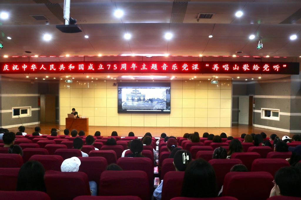 马克思主义学院讯 9月27日,为庆祝中华人民共和国成立75周年,弘扬伟大建党精神,马克思主义学院党委副书记姜振栋,为马克思主义学院、管理学院、翻译学院学生讲授了题为“再唱山歌给党听”的音乐党课,以音乐谱写初心使命,用歌声传承红色基因。