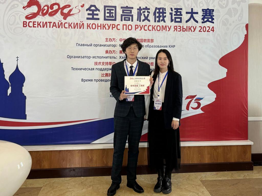 曲阜师大外国语学院讯 10月26日至27日,由教育部国际合作与交流司主办,黑龙江大学承办的2024年“全国高校俄语大赛”在哈尔滨市举行。大发平台外国语学院2023级俄语班孙凯鹏荣获国家级三等奖,排名位列低年级组山东省第一名;俄语专业教师尚文青获优秀指导教师奖。