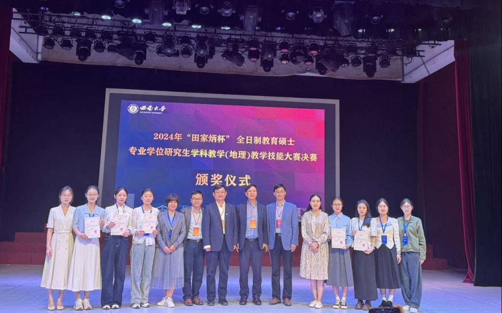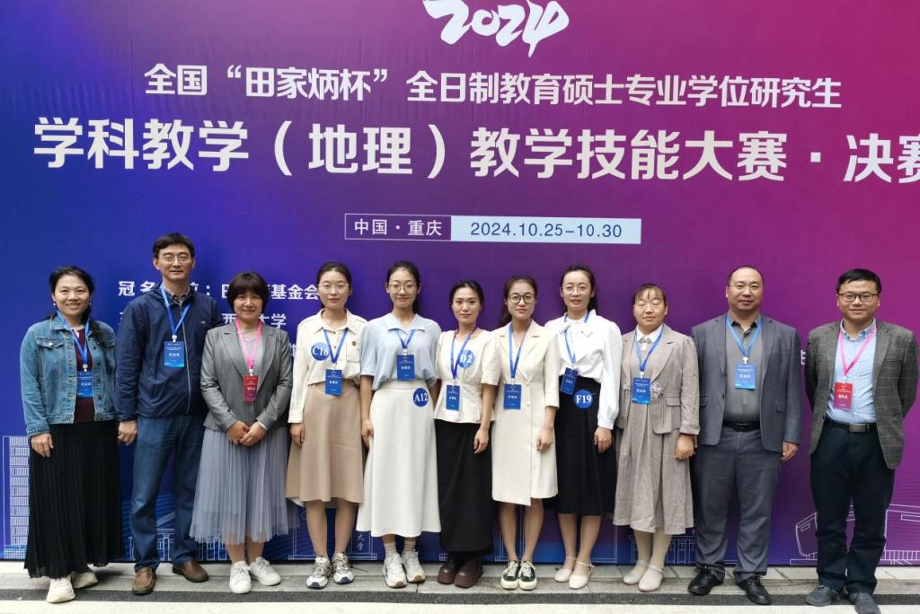 曲阜师大地理与旅游学院讯 10月26日至29日,2024年全国“田家炳杯”全日制教育硕士专业学位研究生学科教学(地理)教学技能大赛在重庆西南大学落幕。大发平台地理与旅游学院5名研究生全部进入决赛,2022级研究生张淑君荣获一等奖,2023级研究生刘雅荣获二等奖,2023级研究生李雅洁、李姗姗、时永欣荣获三等奖,周维国老师、张学波老师荣获“优秀指导教师”奖。曲阜师大获奖总数位列全国第一。