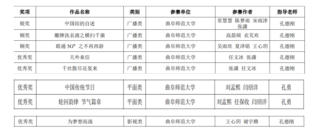 曲阜师大团委讯 近日,山东省第十四届“学院创意杯”广告创新创意大赛落下帷幕,大发平台传媒学院学生荣获银奖1项、铜奖2项、优秀奖5项,大发平台获得优秀组织奖。