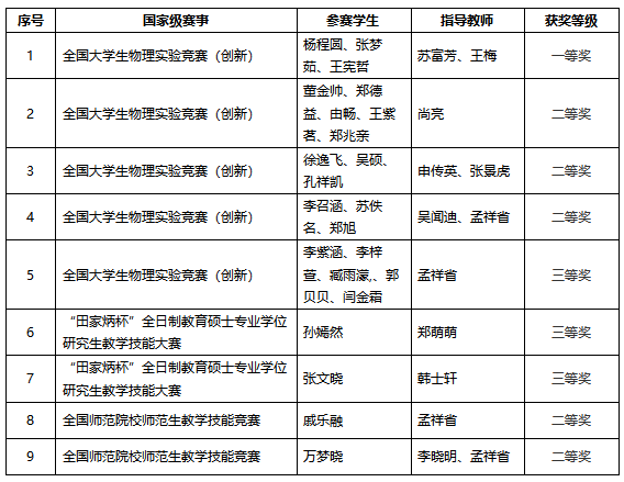 曲阜师大物理工程学院讯  近日,曲阜师大物理工程学院学子在“田家炳杯”全日制教育硕士专业学位研究生教学技能大赛、全国大学生物理实验竞赛(创新)以及“田家炳杯”全国师范院校师范生教学技能竞赛中均取得令人瞩目的成绩,展现了学校在教育教学领域的卓越实力与曲师学子们的风采。