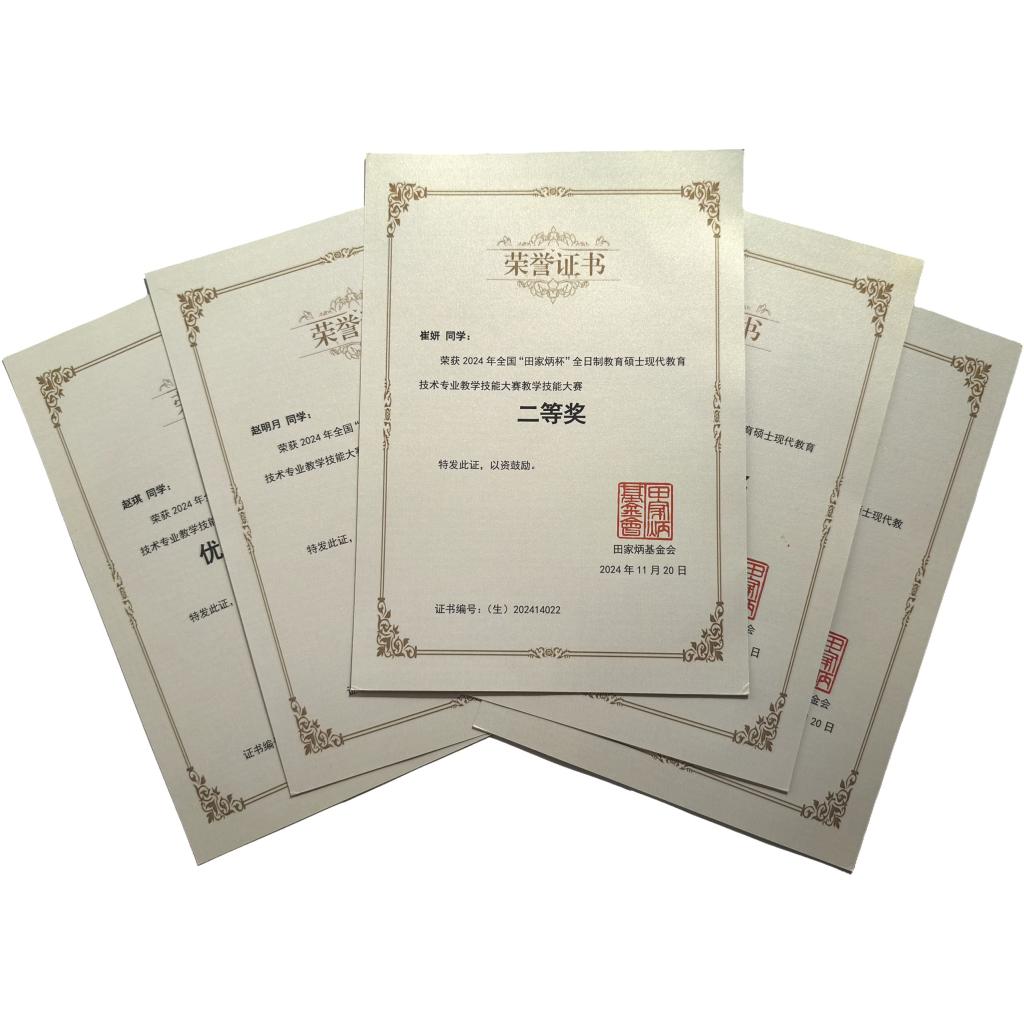 传媒学院讯 2024年全国“田家炳杯”全日制教育硕士现代教育技术专业教学技能大赛决赛于2024年11月8日至10日成功举办。经过现场抽题、限时备课、模拟授课、说课与答辩等环节的激烈角逐,传媒学院现代教育技术专业四名研究生取得佳绩,崔妍荣获二等奖,赵明月荣获三等奖,陈荣龙和赵琪荣获优秀教学设计奖,指导教师赵可云荣获“优秀指导教师”奖。