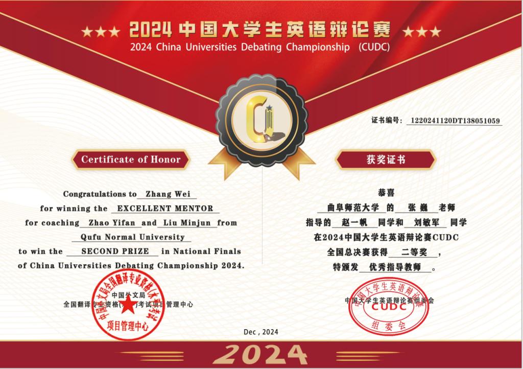 曲阜师大翻译学院讯  12月8日,2024年中国大学生英语辩论赛CUDC全国总决赛顺利收官。经过激烈的角逐,翻译学院张巍副教授指导的2022级商务英语专业赵一帆和2022级翻译专业刘敏军两位同学在辩论赛中展现出精彩的论述,观点清晰,逻辑严谨,经过层层角逐,荣获全国二等奖。赵一帆荣获最佳辩手奖。