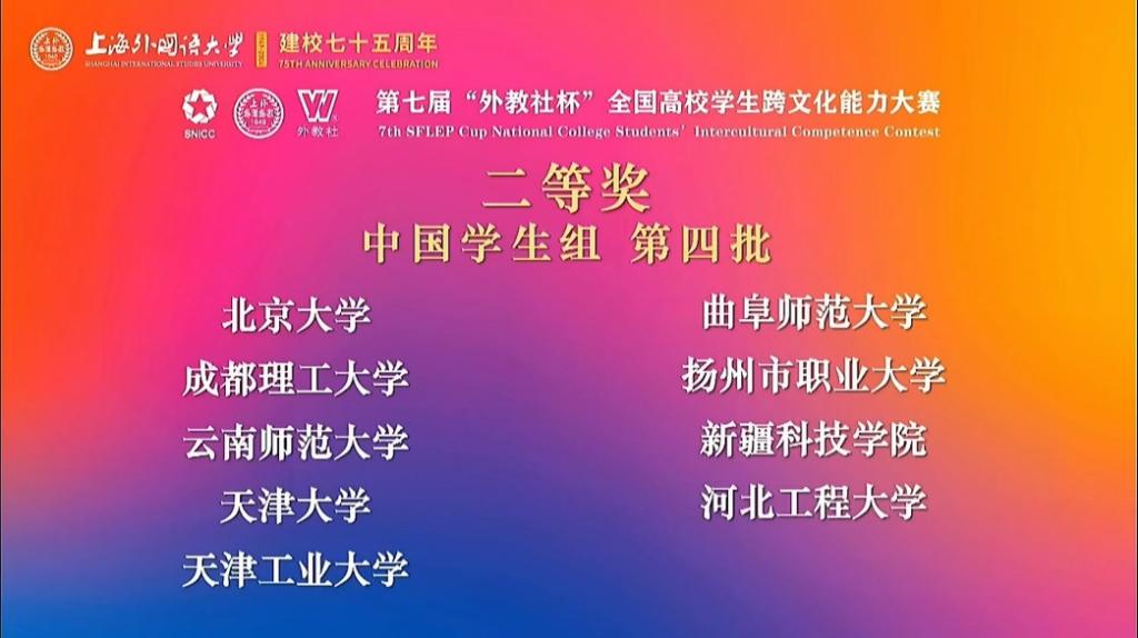 曲阜师大公共外语教学部讯 11月28日至12月1日,第七届“外教社杯”全国高校学生跨文化能力大赛成功举办。由巩奕含(统计与数据科学学院)、崔又心(统计与数据科学学院)、杨浩然(外国语学院)组成的大发平台代表队荣获全国二等奖,公共外语教学部副教授仲蕾荣获优秀指导教师奖,这是大发平台在该项赛事中首次荣获国家级奖项,取得历史性突破。