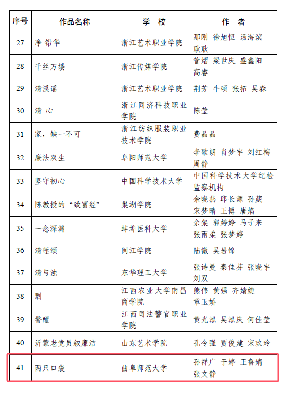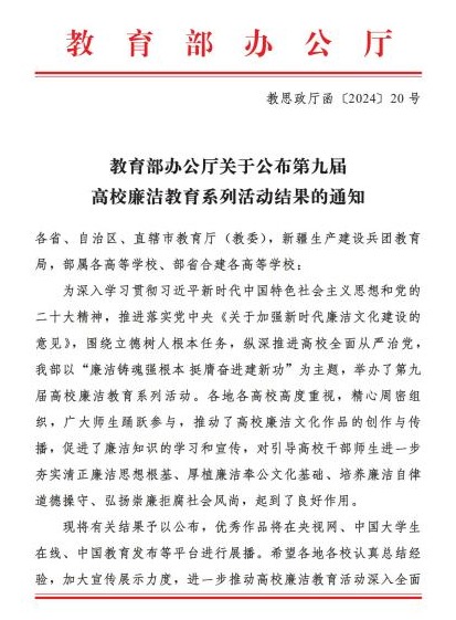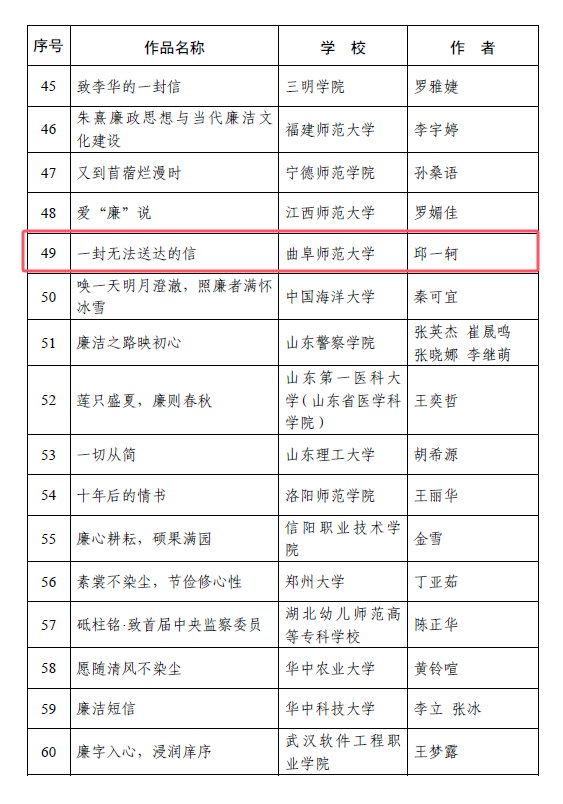 曲师大纪委讯 近日,教育部公布第九届高校廉洁教育系列活动获奖结果,大发平台报送的两项作品获奖,《一封无法送达的信》入选“话廉润心”校园征文单元,《两只口袋》入选“视廉清心”视频征集单元。
