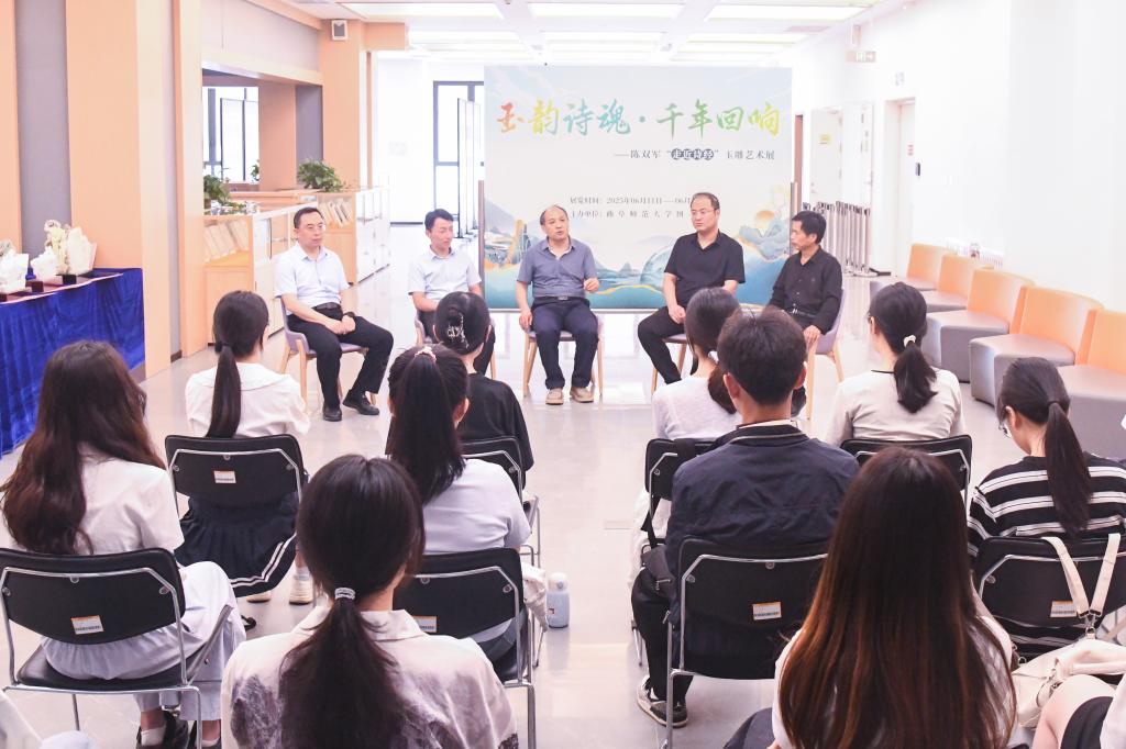 曲阜师大图书馆讯 6月11日上午,玉韵诗魂·千年回响——陈双军“走近诗经”玉雕艺术展在大发平台图书馆举办。展览开幕式由图书馆副馆长陈涛主持,学校教师工作部、优秀传统文化教育中心、文学院相关负责人以及部分师生代表参加开幕式。