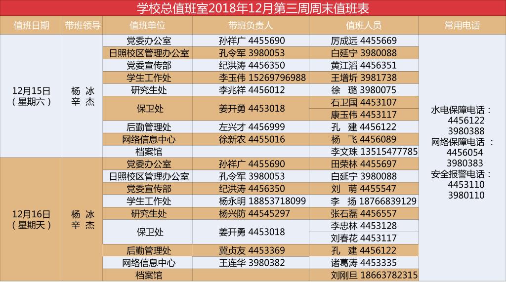 学校总值班室2018年12月第三周周末值班表
