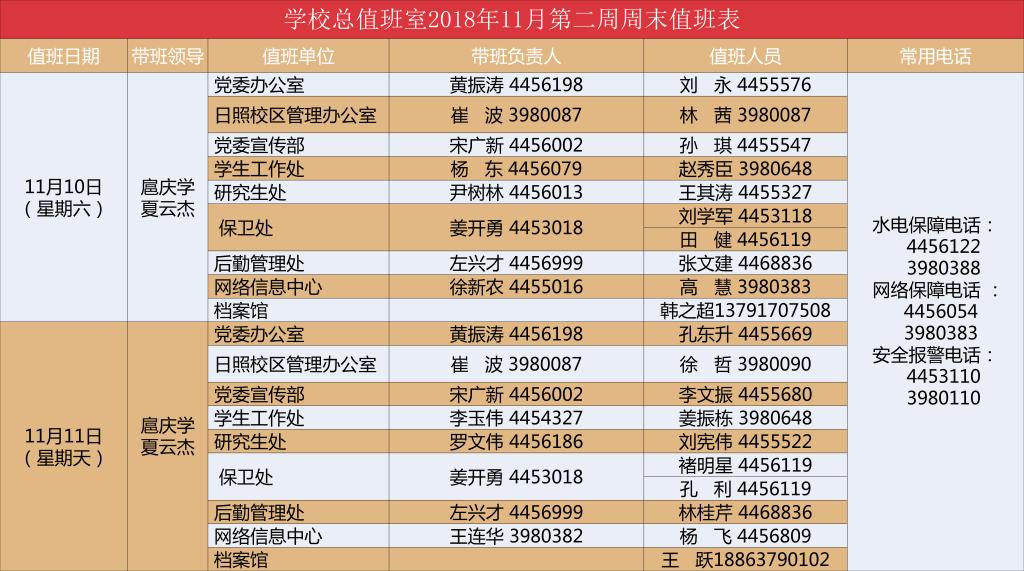 学校总值班室2018年11月第二周周末值班表