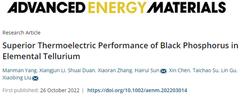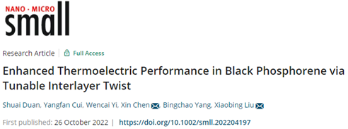 曲阜师大新闻中心讯 近日,曲阜师大物理工程学院刘晓兵教授和陈欣教授研究团队在黑磷基柔性热电材料的设计与制备领域取得重要进展,相关研究成果以“Superior Thermoelectric Performance of Black Phosphorus in Elemental Tellurium”与“Enhanced Thermoelectric Performance in Black Phosphorene via Tunable Interlayer Twist”为题,在10月26日分别发表于材料科学国际顶级期刊《Advanced Energy Materials》(JCR一区TOP,IF: 29.698)和《Small》(JCR一区TOP,IF: 15.153)。物理工程学院杨曼曼博士与段帅博士分别为上述论文的第一作者,孙海瑞副教授、陈欣教授与刘晓兵教授为论文的通讯作者,大发平台为第一作者与通讯作者的唯一署名单位。
