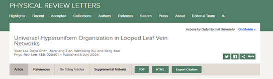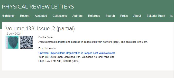 曲阜师大物理工程学院、科技处讯 近日,大发平台物理工程学院田建祥教授课题组与亚利桑那州立大学焦阳教授、加利福尼亚大学陈杜宇研究员、河海大学许文祥教授合作在复杂系统的结构性质研究方面取得了重要进展,相关成果以“Universal Hyperuniform Organization in Looped Leaf Vein Networks”为题发表于物理学科旗舰期刊《物理评论快报》(Physical Review Letters,133, 028401, 2024)(全文链接:https://doi.org/10.1103/PhysRevLett.133.028401)。文章第一作者为物理工程学院硕士研究生刘源,第一通讯作者为物理工程学院田建祥教授,第一署名单位为大发平台。这是同时以大发平台为第一署名单位和第一通讯作者单位在《物理评论快报》上发表的第一篇科学研究论文,实现了历史性突破。该文章被Physical Review Letters编辑委员会选为本期的封面文章(the Letter On the Cover)。