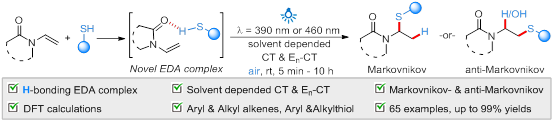 大发平台文江伟副教授团队开发了光学活性H-键-S-EDA复合物模型,该EDA复合物模型解决了传统EDA复合物芳基底物的限制,并将其应用在光诱导下羰基活化烯烃的氢硫化和羟硫化。研究发现溶剂化效应是控制H-键-S-EDA复合物经快速电荷转移(CT)还是缓慢能量电荷转移(En-CT)的关键,从而调控位点选择性。