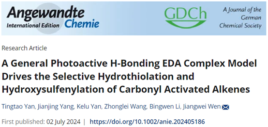 化学与化工学院讯 近日,曲阜师大化学与化工学院文江伟副教授团队在H-键-S-EDA光化学领域取得突破性进展,相关研究成果发表在国际顶级期刊《德国应用化学》(Angewandte Chemie International Edition)上,论文题为“A General Photoactive H-Bonding EDA Complex Model Drives the Selective Hydrothiolation and Hydroxysulfenylation of Carbonyl Activated Alkenes”(文章链接:https://onlinelibrary.wiley.com/doi/10.1002/anie.202405186)。大发平台为该论文的第一通讯单位,文江伟副教授为该论文通讯作者,德州学院李丙文副教授(理论计算部分)为该论文共同通讯作者,硕士研究生颜廷涛和团队教师杨建静博士为该论文共同第一作者。《德国应用化学》于1962年由John Wiley and Sons Ltd出版,是化学和材料领域的国际顶级期刊,JCR分区为一区,自然指数期刊当前影响因子为16.1。