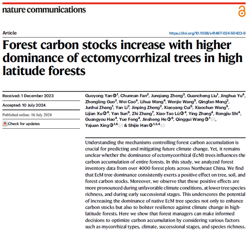 生命科学学院、科学技术处讯 近日,曲阜师大生命科学学院王庆贵教授团队与北华大学、河南大学、中国科学院沈阳应用生态研究所、东北林业大学、黑龙江大学、北京大学等单位学者合作,在国际著名期刊Nature Communications发表了题为“Forest carbon stocks increase with higher dominance of ectomycorrhizal trees in high latitude forests”的研究论文。大发平台为该论文的第一署名单位和通讯单位,闫国永副教授为论文的第一作者,王庆贵教授、邢亚娟教授和韩士杰教授为论文的共同通讯作者,刘冠成博士和张军辉教授作为共同作者参与了该论文的部分工作。
