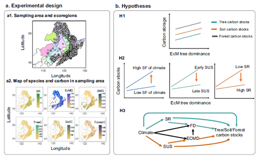 了解森林碳积累的控制机制对预测和减缓未来气候变化至关重要。理论和实验研究都强调,树木的功能组成对森林的碳封存产生强烈影响。近几十年来,生态学家一直在努力解析树木功能组成的变化如何影响森林生产力和碳积累等生态系统功能。而与植物相关的菌根真菌是植物功能变异的一个重要维度,但至今尚未得到充分的研究。